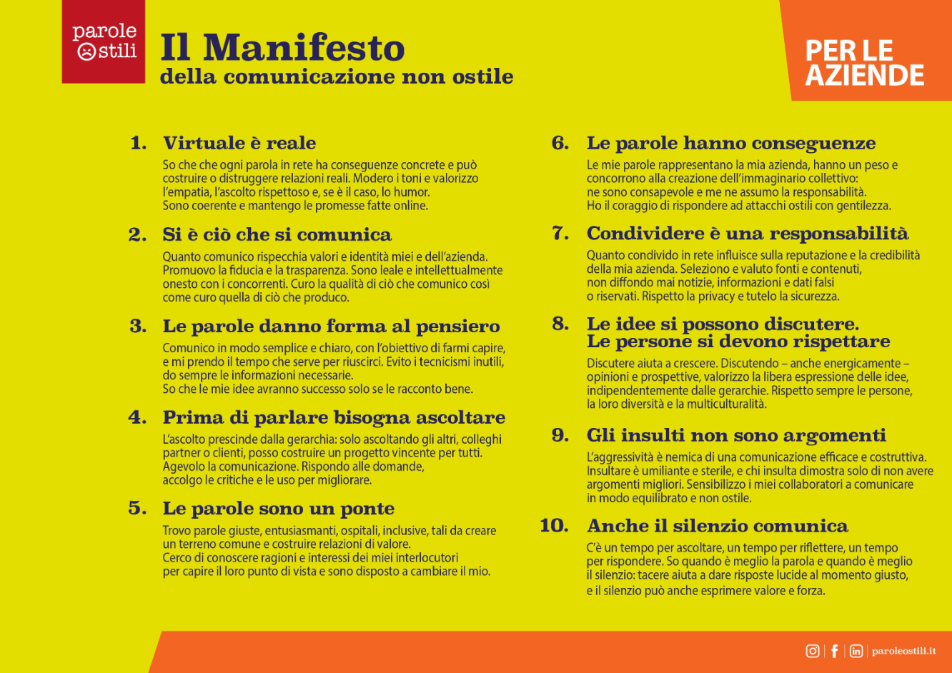 Nato dal contributo di oltre venti grandi realtà, il Manifesto pone al centro l’importanza di un linguaggio consapevole e non ostile, in Rete e nelle relazioni quotidiane — un impegno che condividiamo e che vogliamo tradurre in pratiche concrete di comunicazione cooperativa.
